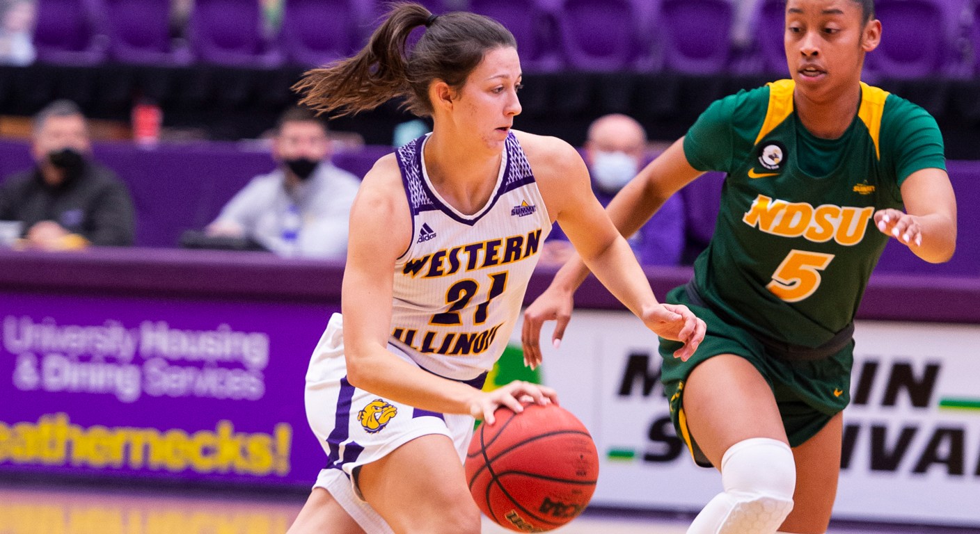 Photo: Western Illinois’ Grace Gilmore drives to the basket during Saturday’s win over North Dakota State. (Sarah Ritter/Western Illinois University)