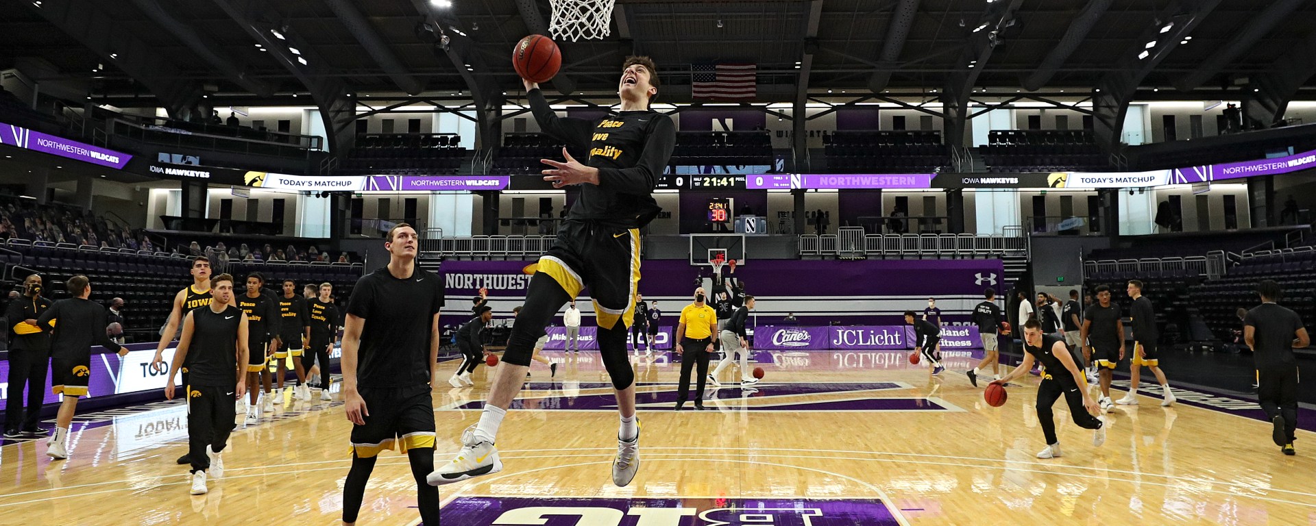 Photo: Iowa’s Patrick McCaffery goes in for a dunk during warmups before Sunday’s game at Northwestern. (Brian Ray/hawkeyesports.com)