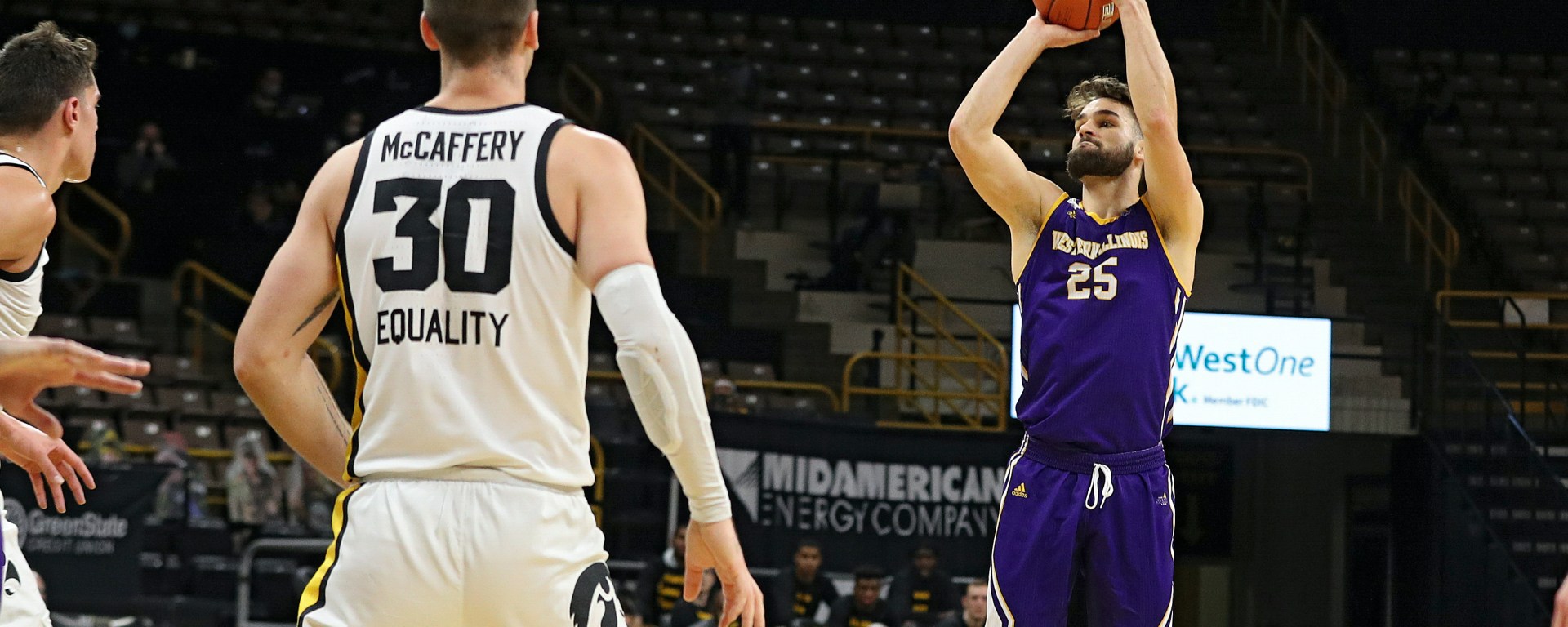 Photo: Western Illinois’ Will Carius shoots in the season opener against Iowa. Carius is the Leathernecks’ leading scorer at 15.7 points per game this season. (Stephen Mally/hawkeyesports.com)