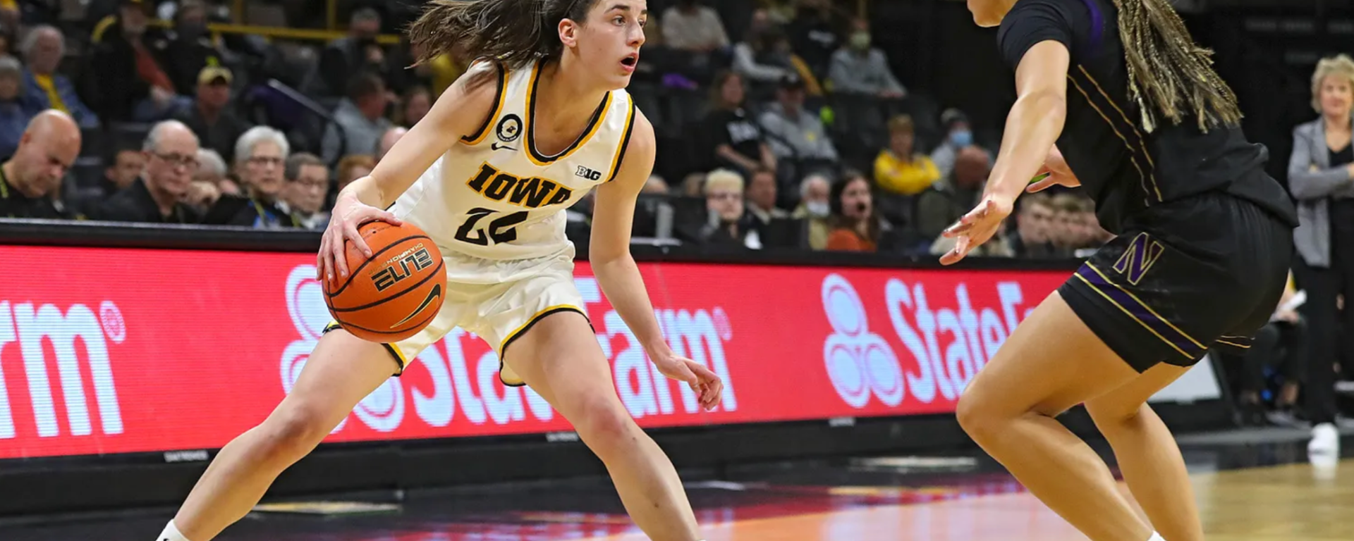 Photo: Iowa’s Caitlin Clark looks for an opening in Northwestern’s defense in a home game earlier this month. (Stephen Mally/hawkeyesports.com)