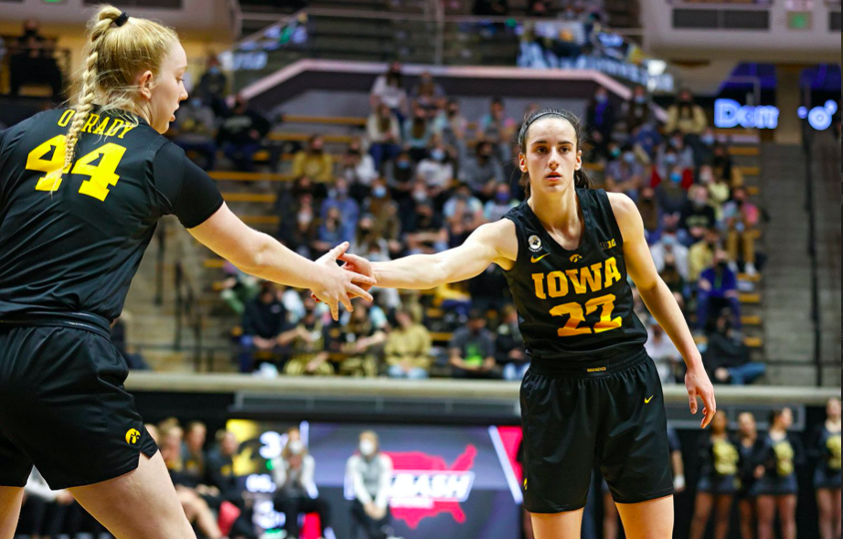 Photo: Iowa’s Caitlin Clark (right) and Addison O’Grady react after a play in a win over Purdue earlier this season. (Stephen Mally/hawkeyesports.com)