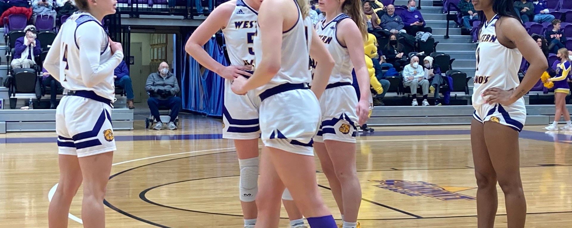 Photo: Western Illinois guard Elizabeth Lutz (left) talks to her teammates coming out of a timeout.