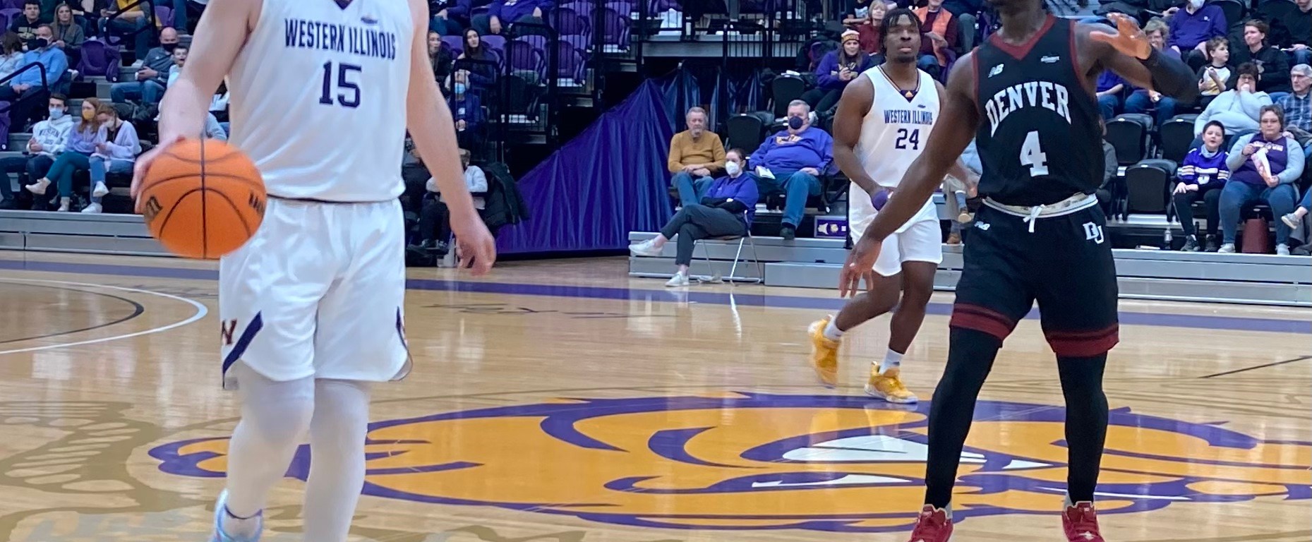 Photo: Western Illinois’ Colton Sandage (left) is guarded by Denver’s Taelyr Gatlin in the second half.