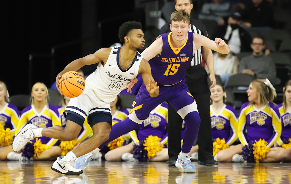 Photo: Western Illinois guard Colton Sandage (15) defends Oral Roberts’ Issac McBride in the first half of Sunday’s Summit League tournament quarterfinal. (Richard Carlson/Inertia)