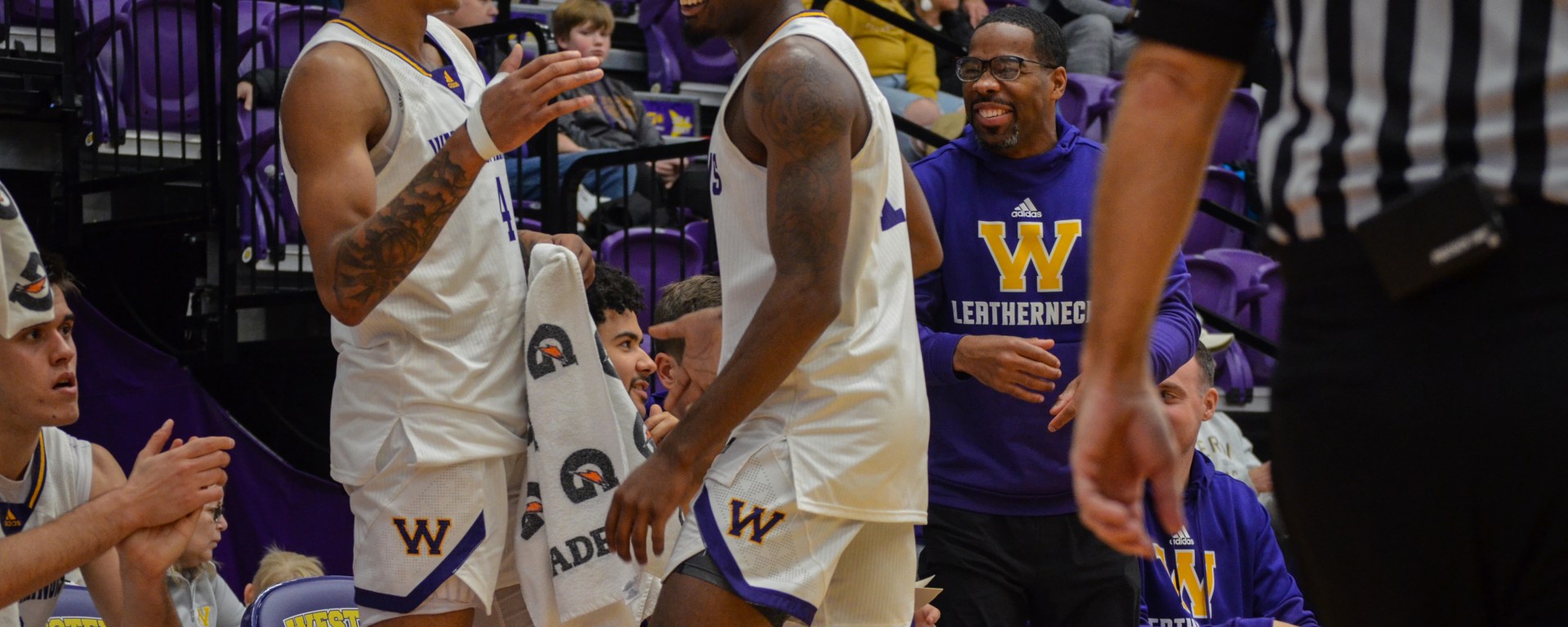 Photo: Western Illinois’ Jesiah West (left) laughs with Quinlan Bennett in the closing minutes of Saturday’s win. (WIU Athletic Communications)