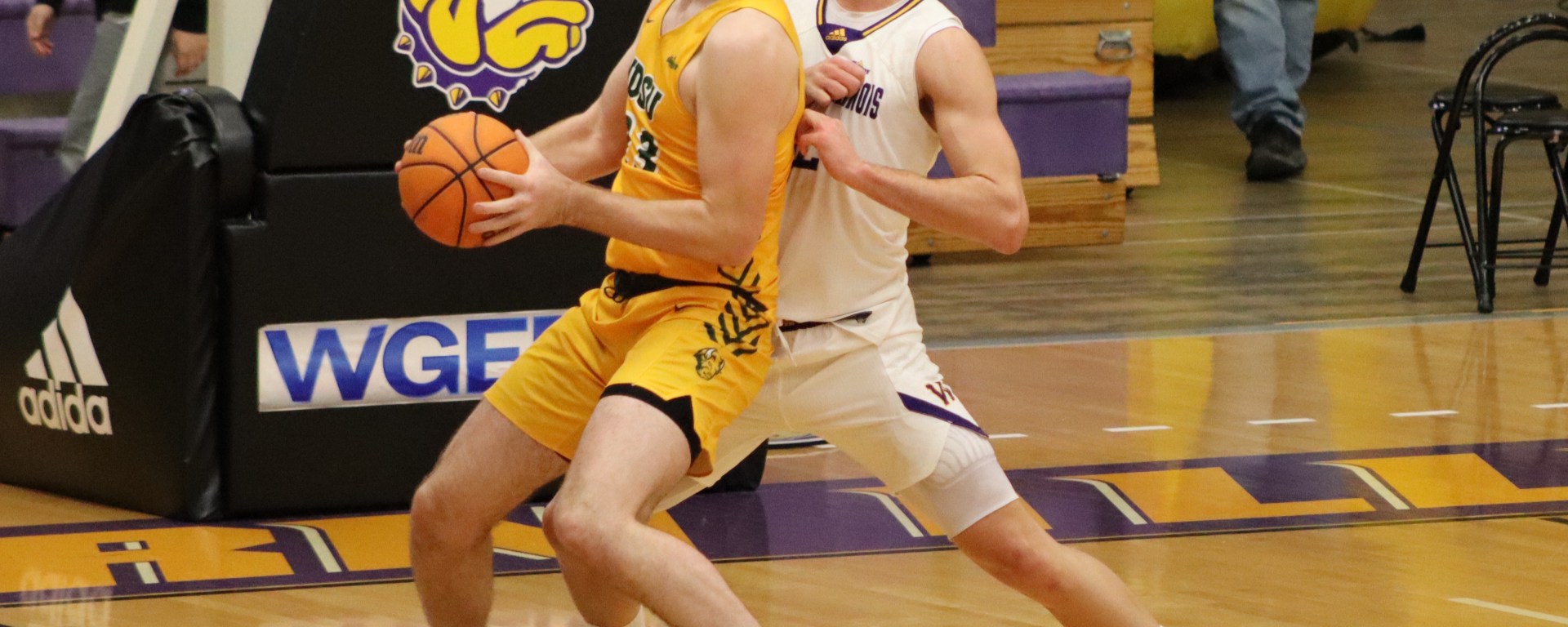 Photo: WIU’s Vuk Stevanic (right) tries to defend North Dakota State’s Andrew Morgan in Monday’s game. (Photo courtesy of WIU Athletic Communications)