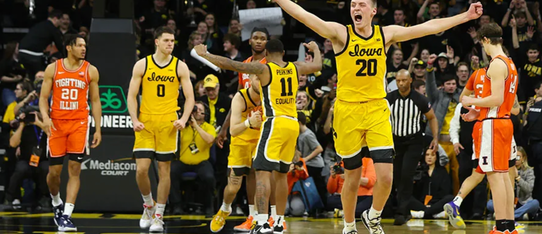 Photo: Iowa’s Payton Sandfort (20) and his teammates celebrate after Saturday’s win over Illinois. (Stephen Mally/hawkeyesports.com)