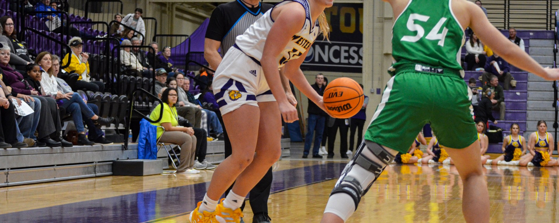 Photo: Western Illinois’ Anna Deets looks for an opening in North Dakota’s defense in Thursday’s game. (Photo courtesy of WIU Athletic Communications)