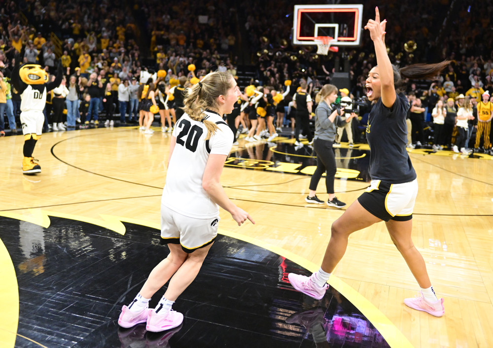 Photo: Iowa’s Kate Martin (20) and Hannah Stuelke celebrate after the Hawkeyes’ win over Indiana last season. (Keith Gillett/Icon SportsWire)