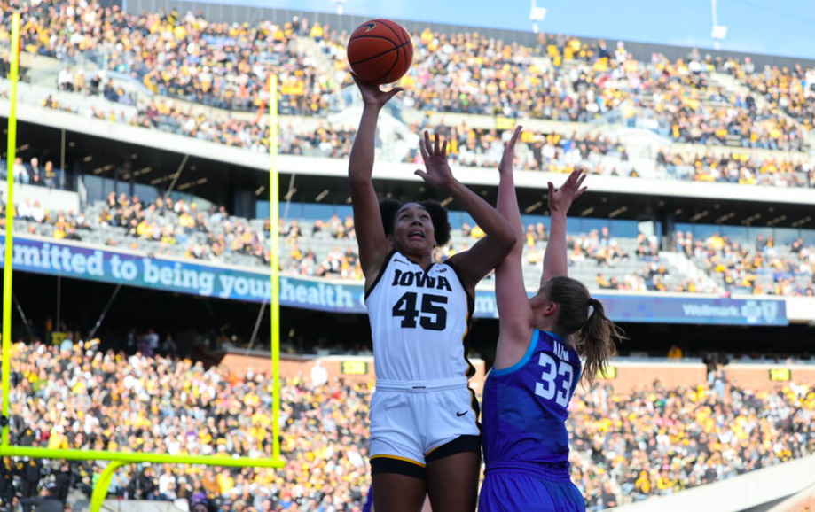 Photo: Iowa forward Hannah Stuelke shoots during Sunday’s “Crossover at Kinnick” game against DePaul at Kinnick Stadium. (Stephen Mally/hawkeyesports.com)