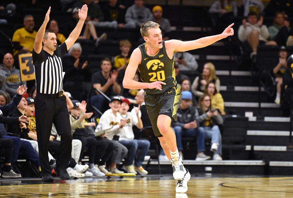 Photo: Iowa’s Payton Sandfort reacts after a 3-pointer in a game against Northern Illinois earlier this season. (Keith Gillett/Icon SportsWire)