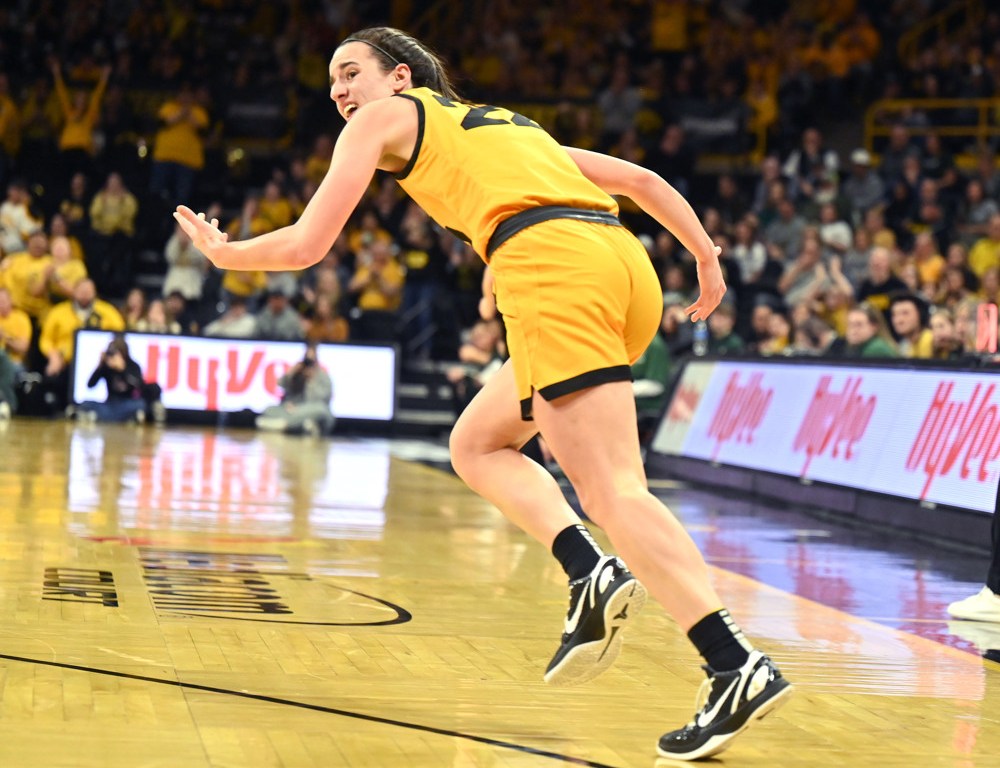 Photo: Iowa’s Caitlin Clark celebrates a 3-pointer in last Tuesday’s win over Michigan State. (Keith Gillett/Icon SportsWire)