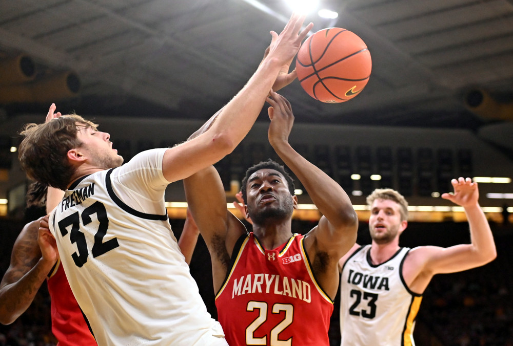Photo: Iowa’s Owen Freeman (left) blocks a shot by Maryland’s Jordan Geronimo in last Wednesday’s game. (Keith Gillett/Icon SportsWire)