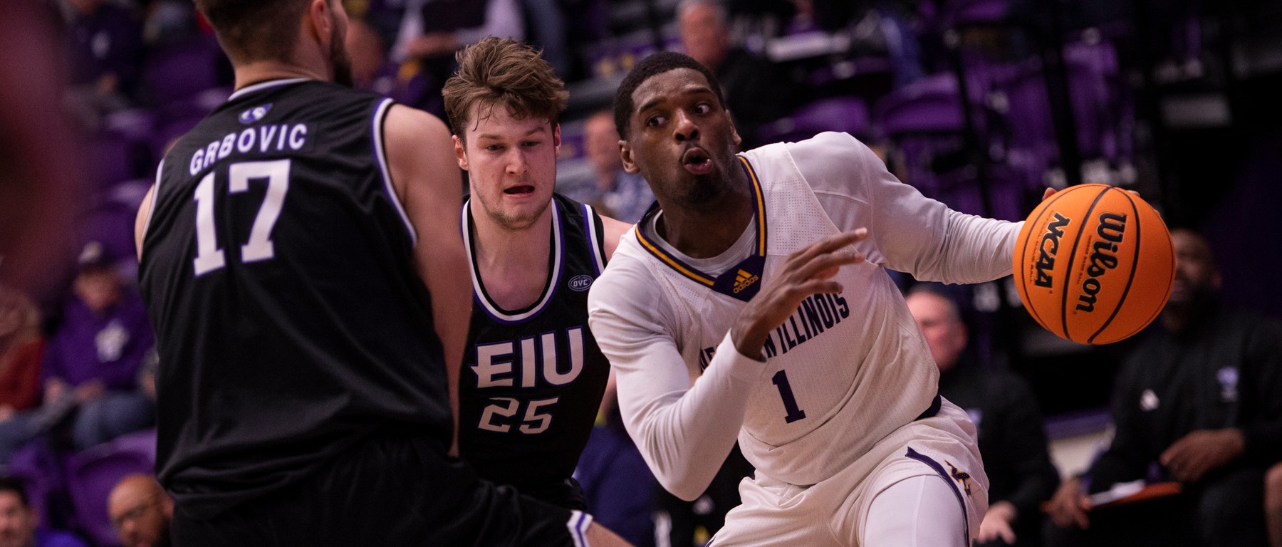 Photo: Western Illinois guard Quinlan Bennett (right) looks to get past Eastern Illinois’ Lazar Grbovic in Thursday’s game. (Photo courtesy of WIU Athletic Communications)