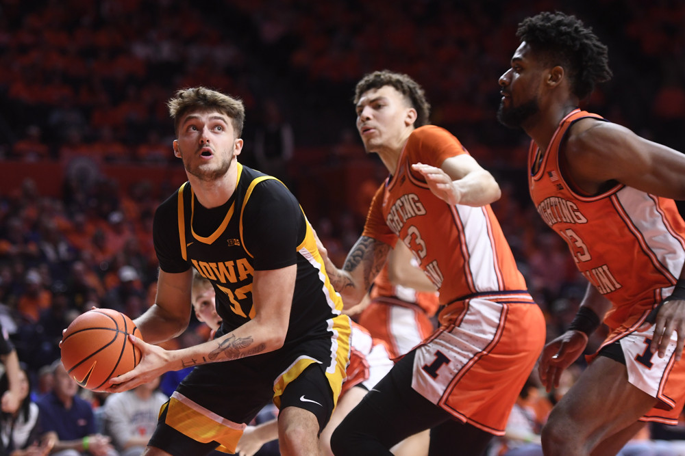 Photo: Iowa’s Owen Freeman (32) works the ball inside against Illinois’ Coleman Hawkins (center)) and Quincy Guerrier during a game last season. (Michael Allio/Icon Sportswire)