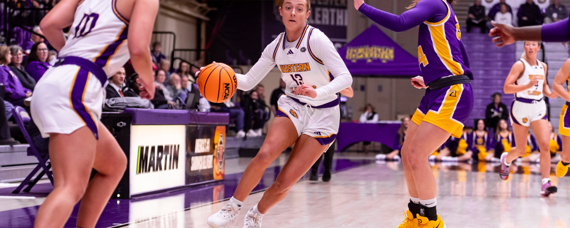 Photo: Western Illinois guard Addi Brownfield (center) looks for an opening to drive against Tennessee Tech’s defense in the first half of Tuesday’s game. (WIU Athletic Communications)