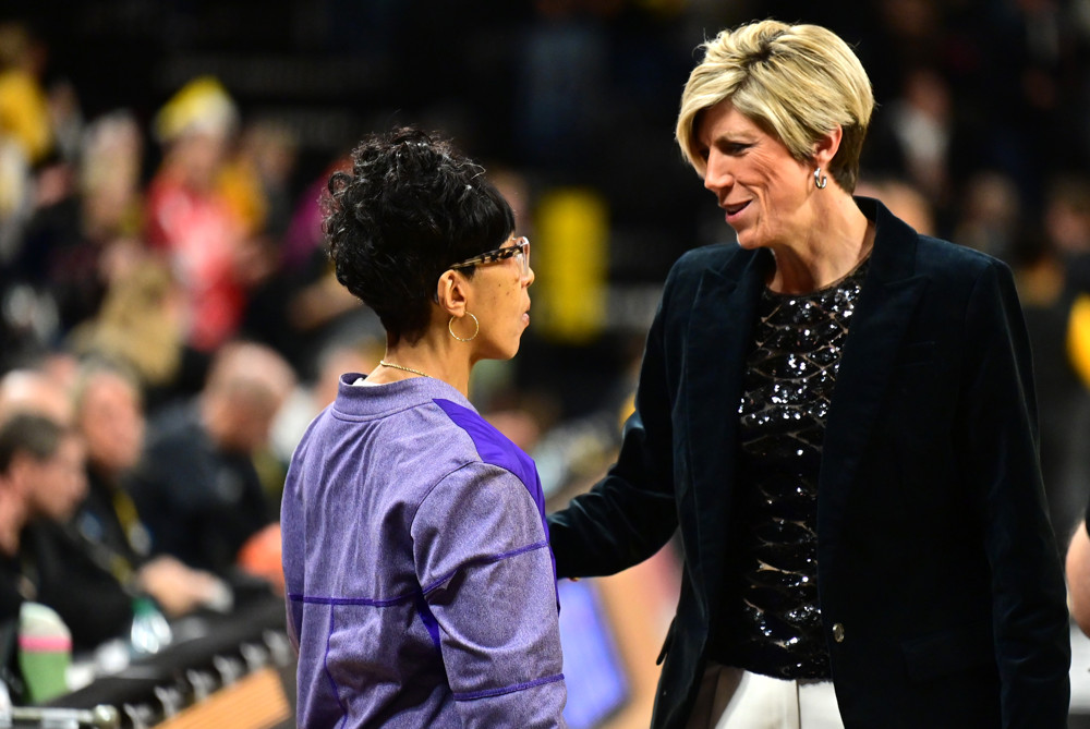 Photo: UNI coach Tanya Warren (left) and Iowa coach Jan Jensen talk before Friday’s game. (Keith Gillett/Icon Sportswire)