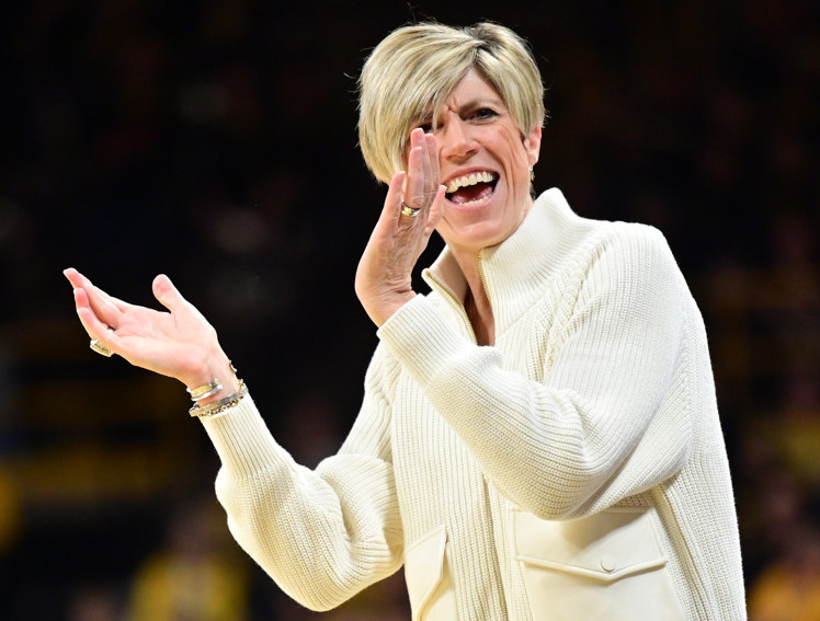 Photo: Iowa coach Jan Jensen celebrates during the Hawkeyes’ 85-80 win over Northwestern on Tuesday. (Keith Gillett/Icon Sportswire)