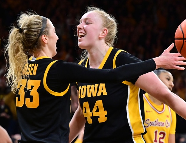 Photo: Iowa’s Lucy Olsen (left) and Addison O’Grady celebrate a second-half basket in the Hawkeyes’ 76-67 win over USC. (Keith Gillett/Icon Sportswire)