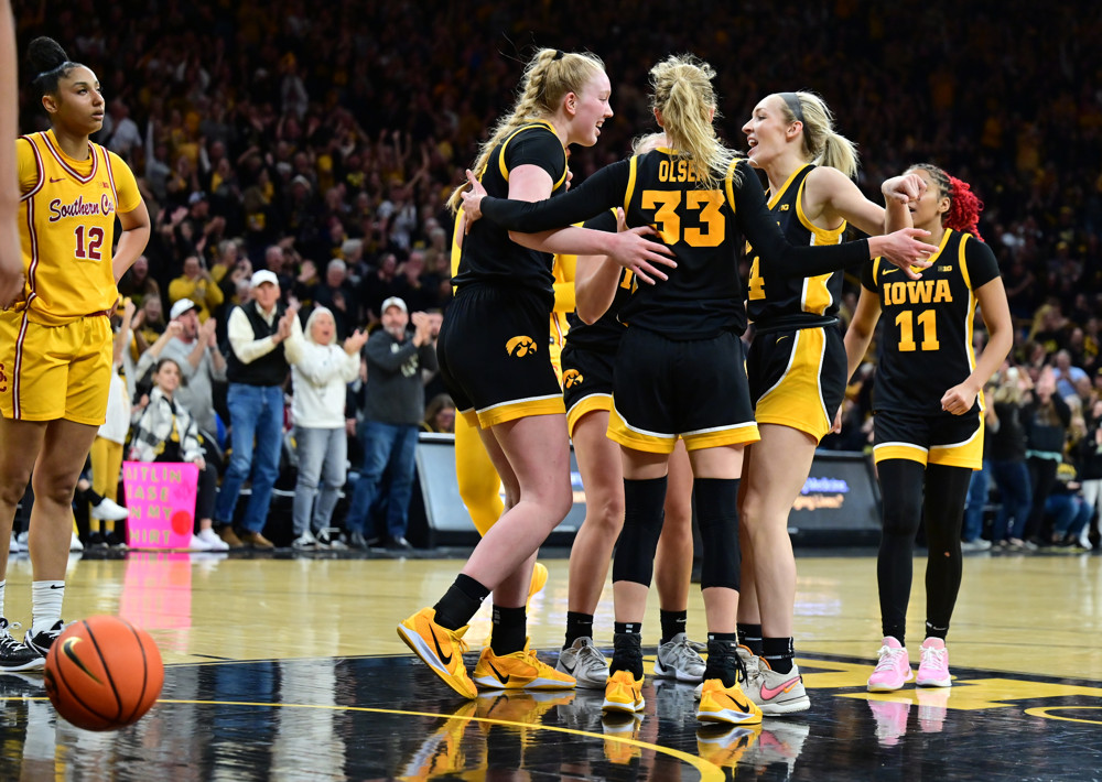 Photo: Iowa’s players celebrate a basket in their win over USC on February 2. (Keith Gillett/Icon Sportswire)