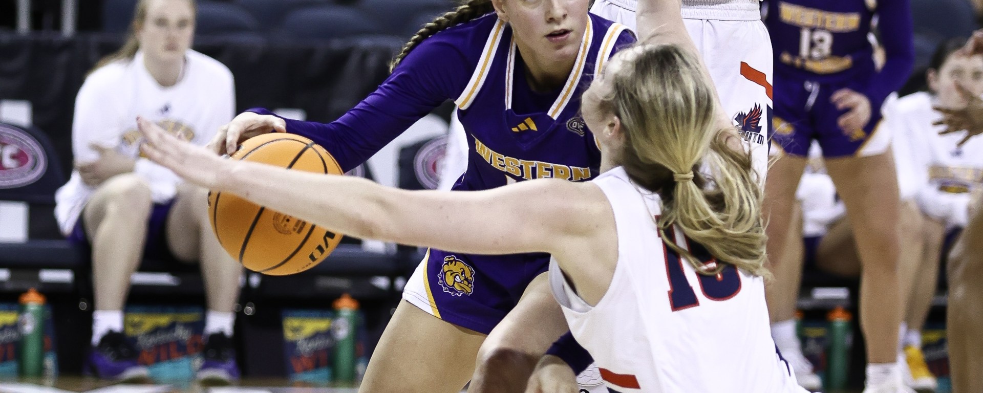 Top photo: Western Illinois’ Raegan McCowan is defended by UT-Martin’s Morgan Borgstedt in Wednesday’s Ohio Valley Conference tournament. (Photo courtesy of WIU Athletic Communications)