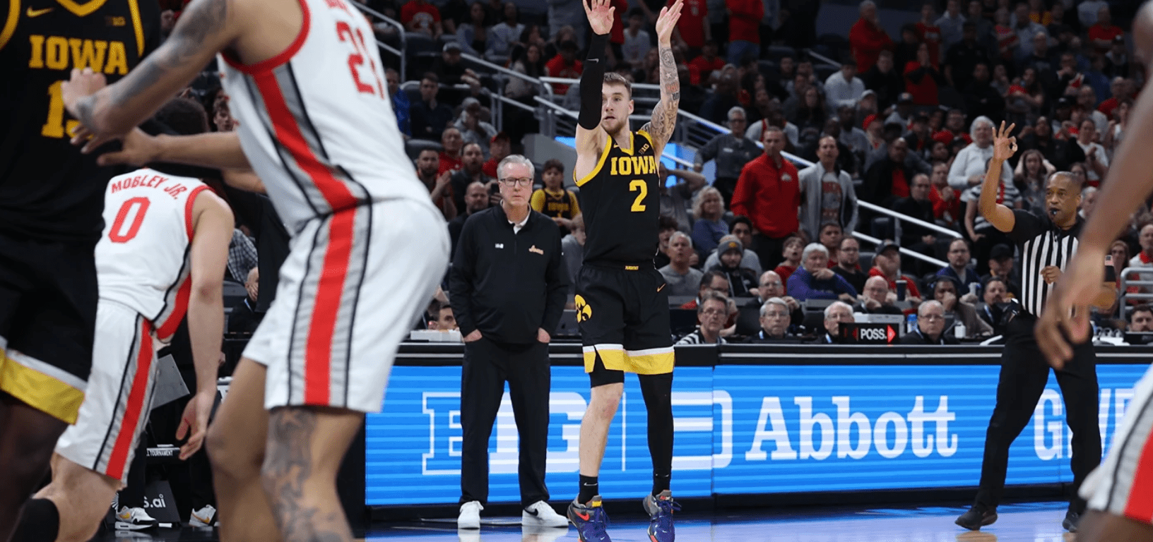 Photo: Iowa’s Brock Harding hits a late 3-pointer in the 77-70 win over Ohio State in the Big Ten Tournament. (Stephen Mally/hawkeyesports.com)