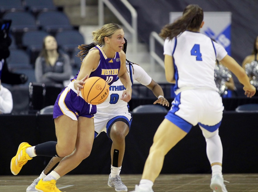 Photo: Western Illinois’ Mallory McDermott looks for an opening in the Eastern Illinois defense during the Ohio Valley Conference tournament. (Photo courtesy of the OVC).