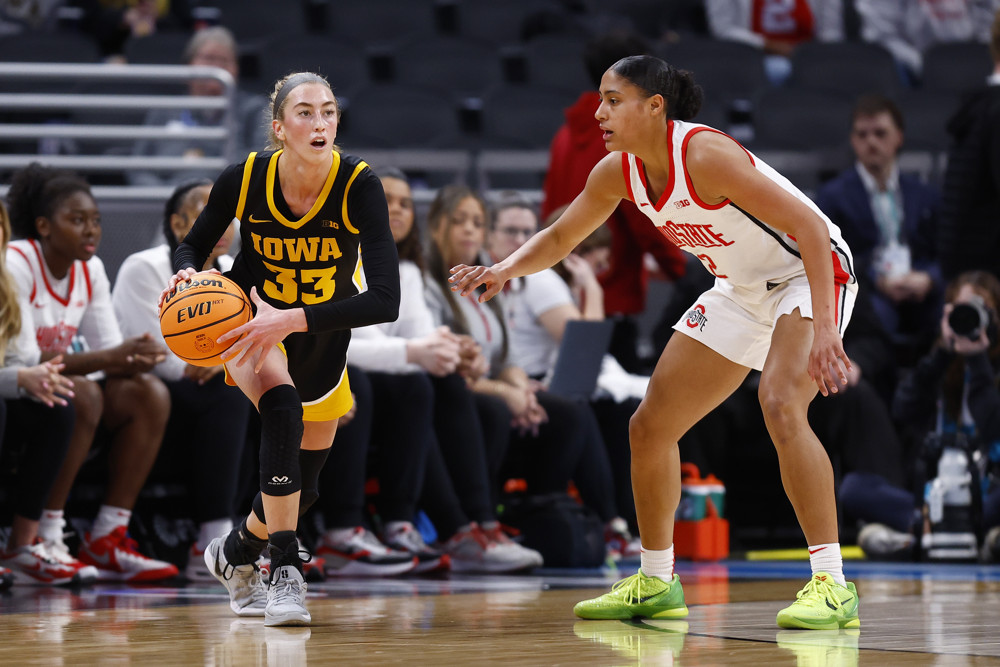 Photo: Iowa’s Lucy Olsen (left) was selected in the second round of the WNBA Draft on Monday. (Jeffrey Brown/Icon Sportswire)