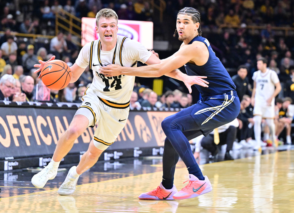 Photo: Iowa guard Bennett Stirtz (left) drives past Xavier guard Malik Messina-Moore in the first half of Friday’s game. (Keith Gillett/Icon Sportswire)