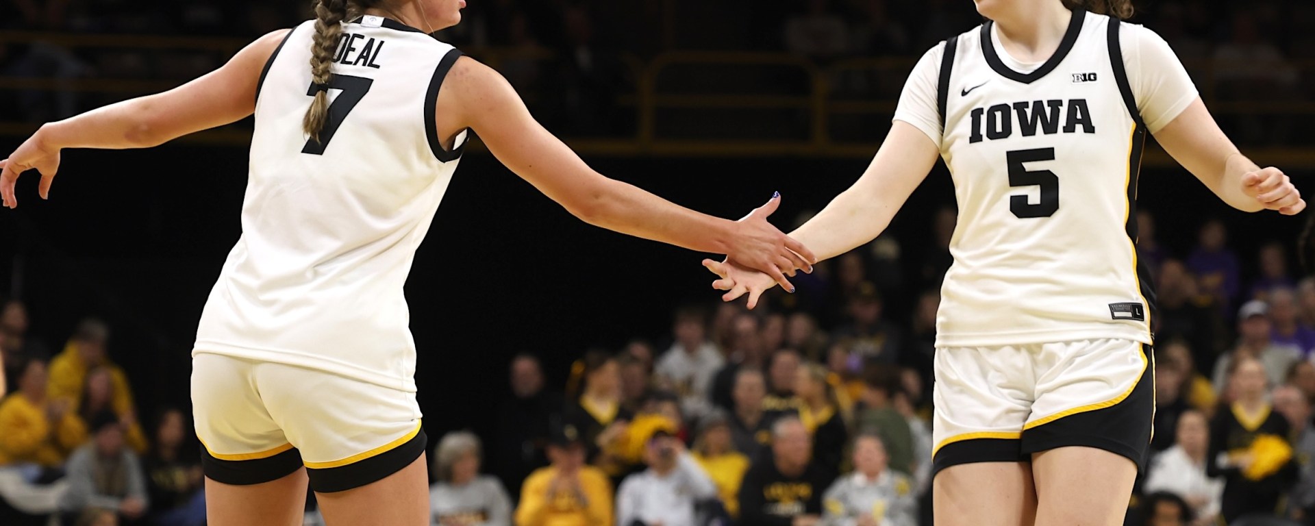 Photo: Iowa’s Addie Deal (left) congratulates Ava Heiden after a first-half basket in Wednesday’s game against Western Illinois. (John Gaines Photography)