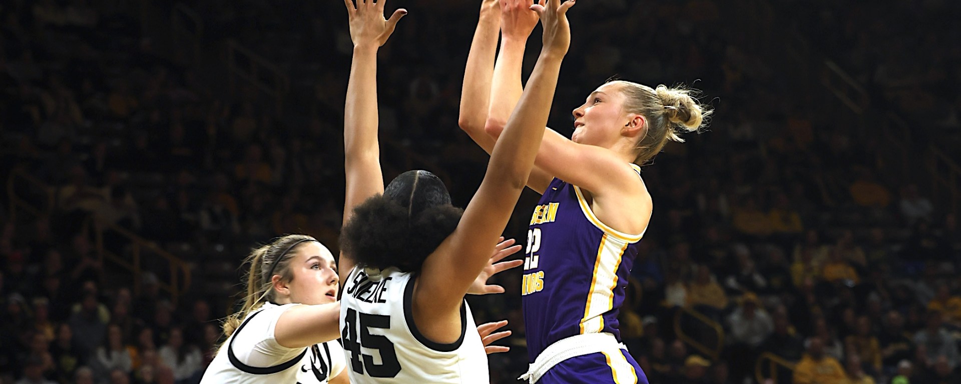 Photo: Western Illinois’ Mia Nicastro shoots over Iowa’s Hannah Stuelke and Layla Hays in Wednesday’s game. (John Gaines Photography)