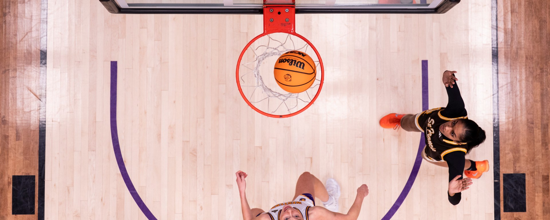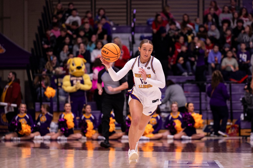 Top photo: Western Illinois’ Mia Nicastro (center) watches a shot go in during Thursday’s game with St. Francis. (WIU Athletic Communications)