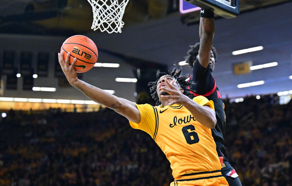 Photo: Iowa’s Tavion Banks drives to the basket in Saturday’s game against Maryland. (Keith Gillett/Icon Sportswire)