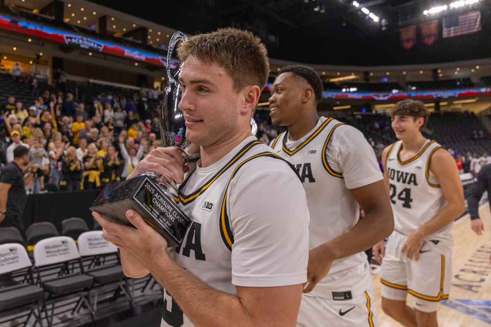 Photo: Iowa’s Brendan Hausen carries the Acrisure Classic championship trophy after the Hawkeyes’ win over Grand Canyon last month. (Greg Fiore/Icon Sportswire)