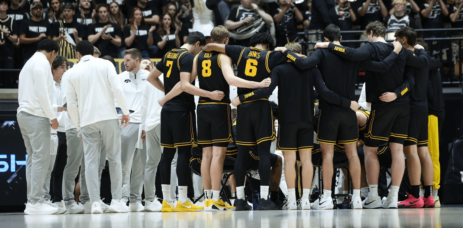 Photo: Iowa’s players huddle during Wednesday’s loss at Purdue. (Photo from Iowa Athletic Communications)