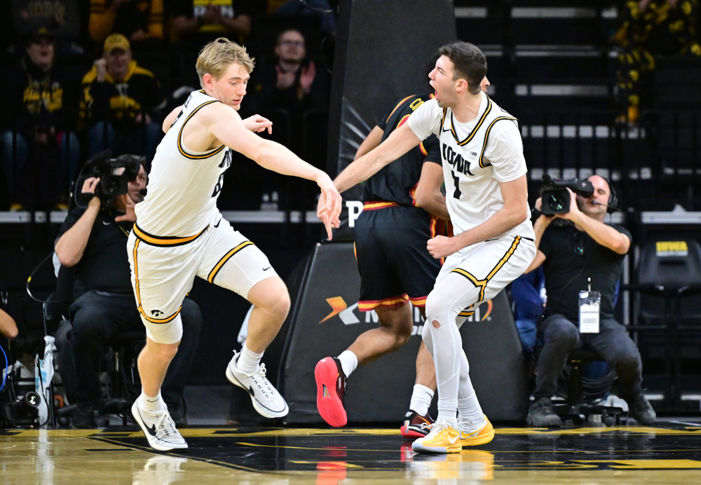 Photo: Iowa’s Alvaro Folgueiras (right) celebrates with teammate Cooper Koch after hitting a 3-pointer in Wednesday’s win over USC. (Keith Gillett/Icon Sportswire)
