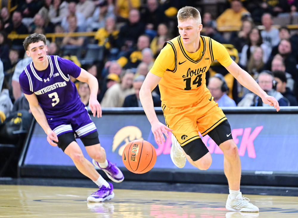 Photo: Iowa’s Bennett Stirtz chases a loose ball in the second half of Sunday’s win over Northwestern. (Keith Gillett/Icon Sportswire)