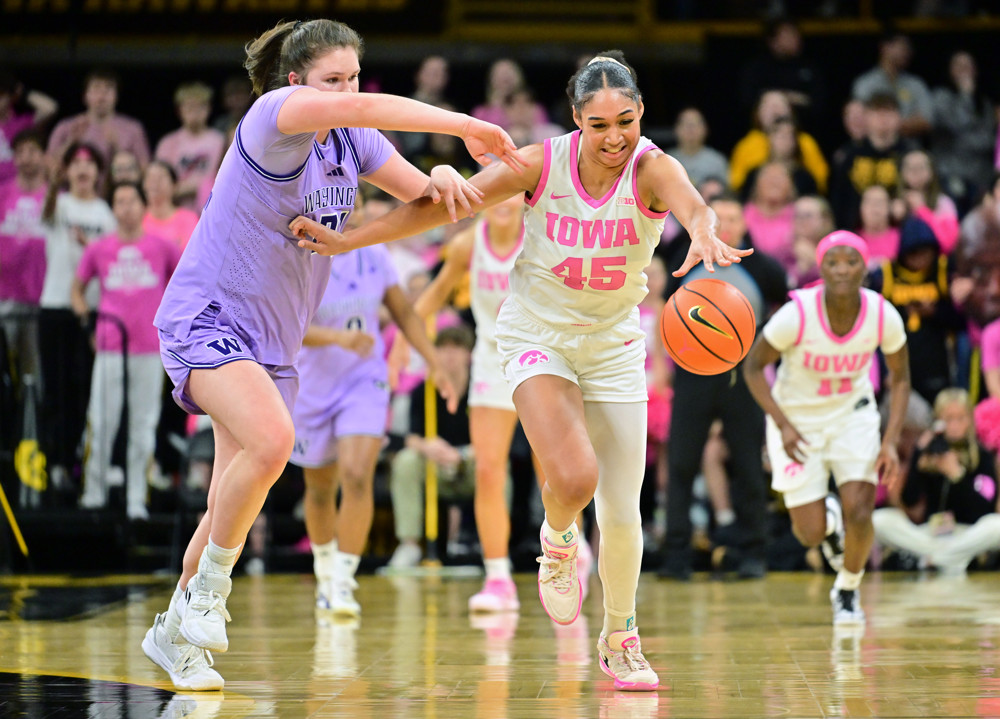 Photo: Iowa’s Hannah Stuelke (right) comes up with a steal in Wednesday’s win over Washington. (Keith Gillett/Icon Sportswire)