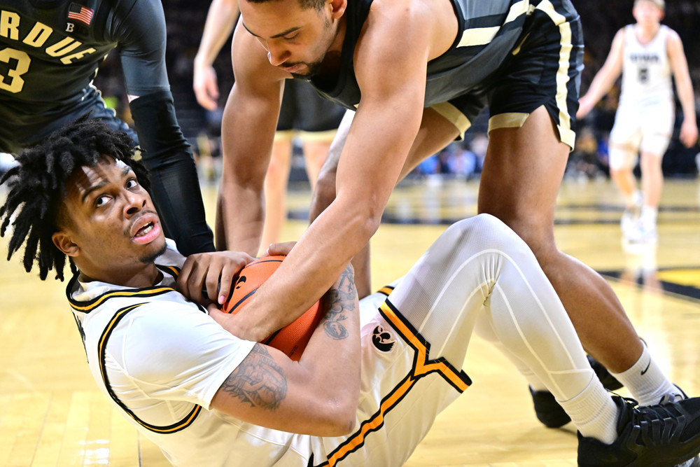 Photo: Iowa’s Tavion Banks fights for a loose ball in Saturday’s game against Purdue. (Keith Gillett/Icon Sportswire)