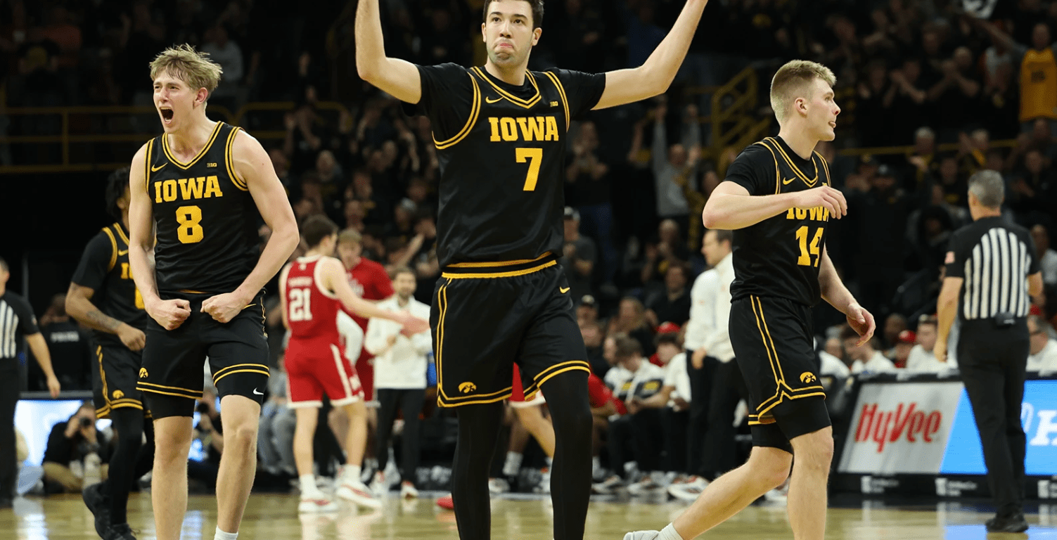 Photo: Iowa’s Cooper Koch (left), Alvaro Folgueiras (center) and Bennett Stirtz react during Tuesday’s win over Nebraska. (Photo courtesy of Iowa Athletic Communications)