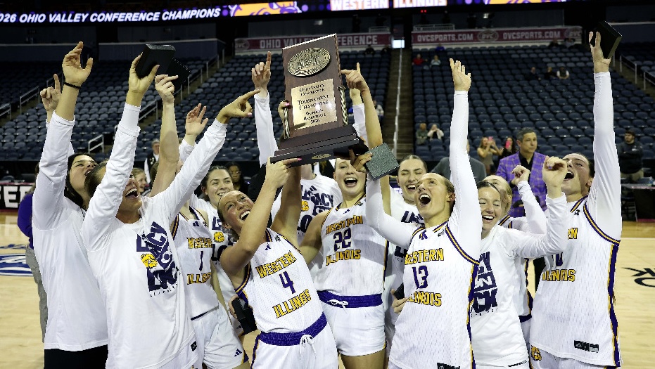Photo: Western Illinois’ women’s basketball team celebrates winning the Ohio Valley Conference tournament on Saturday. (Photo from the Ohio Valley Conference)