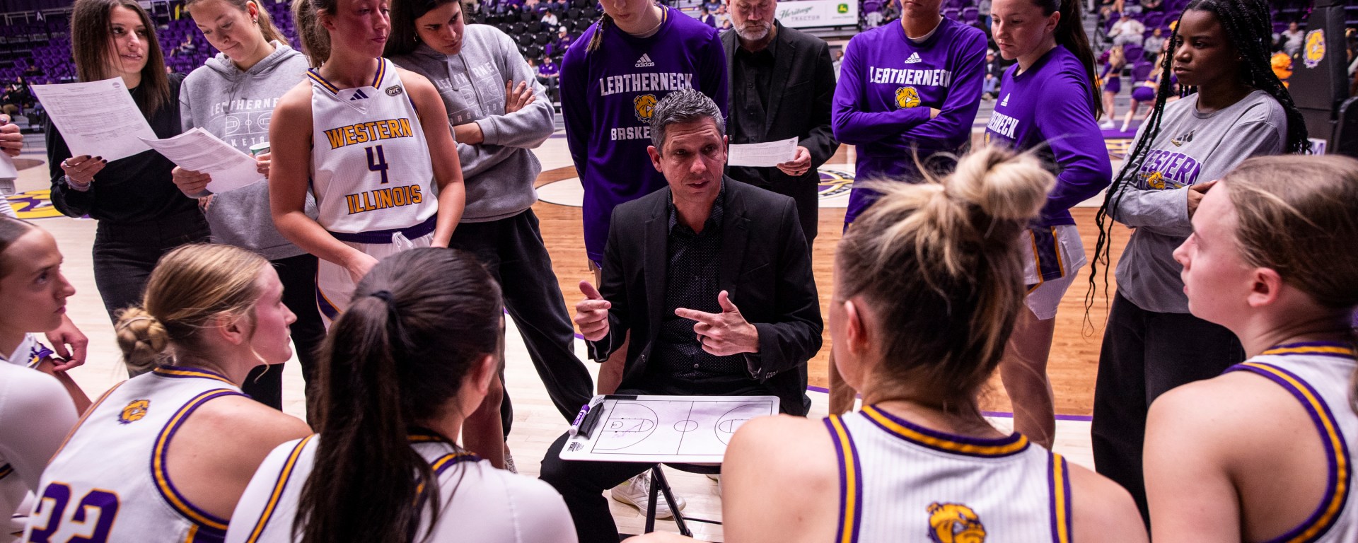 Photo: Western Illinois coach JD Gravina talks to his team during a timeout in a game earlier this season. (WIU Athletic Communications)