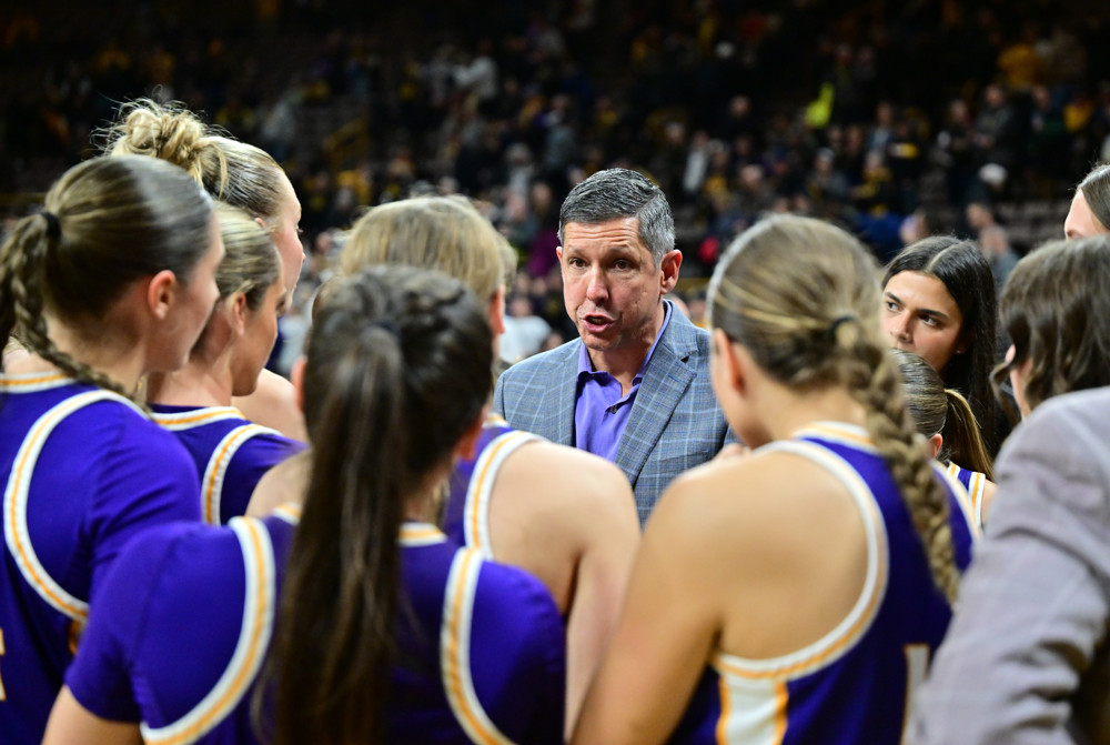 Photo: Western Illinois coach JD Gravina talks to his team during a timeout in last November’s game at Iowa. (Keith Gillett/Icon Sportswire)